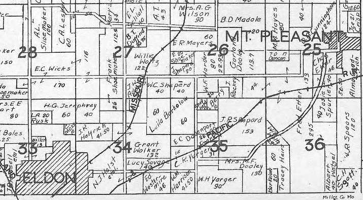 His aunt, Delpha (known as Della) Haynes Jemphrey (married to Harvey Jemphrey) inherited a significant amount of land around Eldon. The farm where she lived was just north of Eldon. On old plat maps of Eldon the land lists Harvey Jemphrey as owner. In this next photo look in section numbers 33 and 34 to see the Jemphrey farm (photo 66).