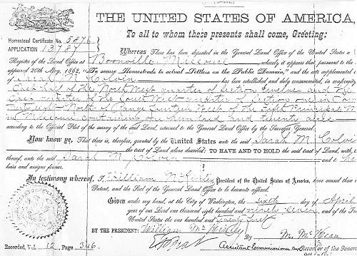 James’ father, Sterling Maynard Colvin, had died early in life and his mother, Sarah Melissa Cochran Colvin, had to take over the management of the original Colvin farm in Miller County. She was the one who completed the paperwork for homesteading the farm in 1897. Here is a portion of the official declaration of the homesteading of the property (photo 62).