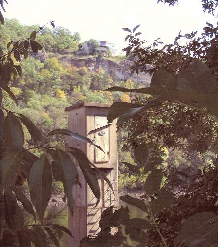 “This is the old Bagnell River Gauge house. I don't have any specific information on this gauge, as we have used USGS data from the Hwy 54 bridge gauge since that bridge was built in the early 1970's. This gauge station was discontinued, I assume (but don't know for sure) at the same time the bridge was built.”